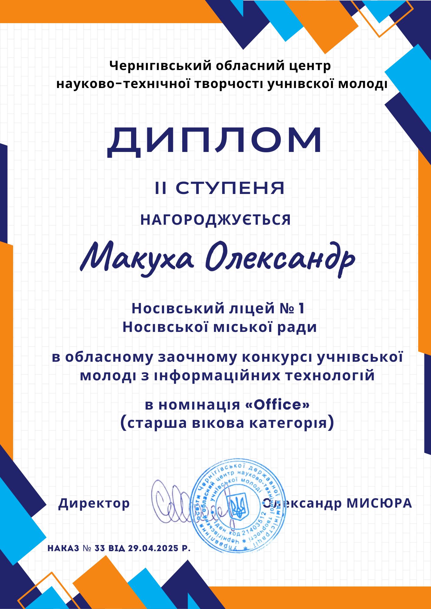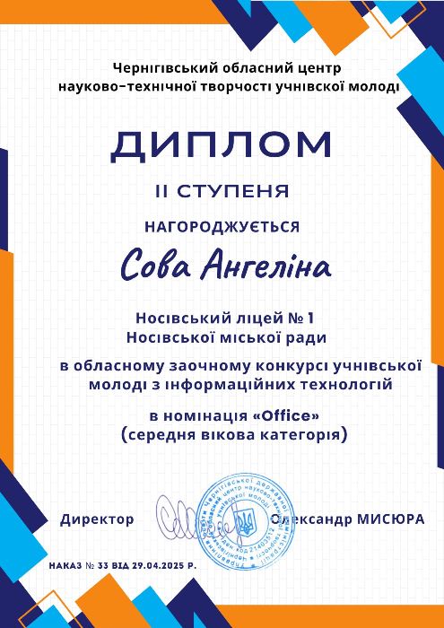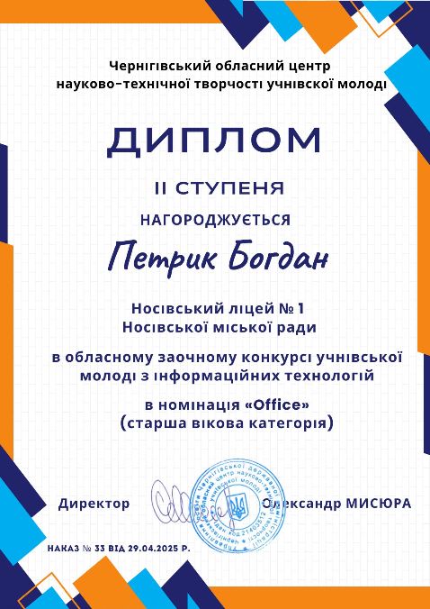 Ліцеїсти нашого закладу здобули дипломи переможців обласного заочного конкурсу учнівської молоді з інформаційних технологій в номінації «Office». Конкурс було проведено Чернігівським обласним центром науково-технічної творчості учнівської молоді в квітні 2025 року.